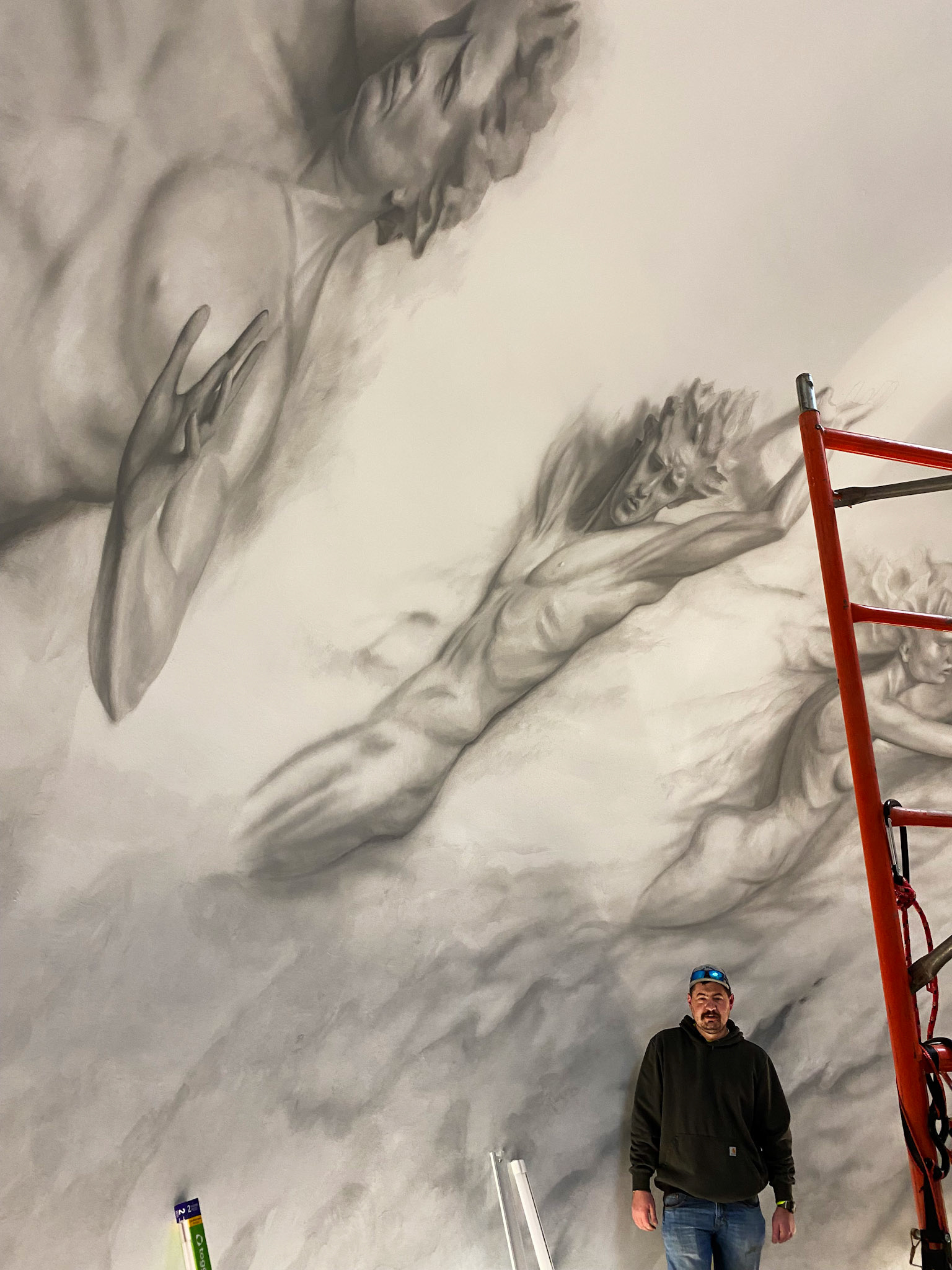Progress shot of mural commissioned for 30 ft high dome mural in Cleveland TN. I'll post the finished images when I return and the 10 levels of scaffold are removed. That's Dale the electrician, btw. He kept me company for a day.