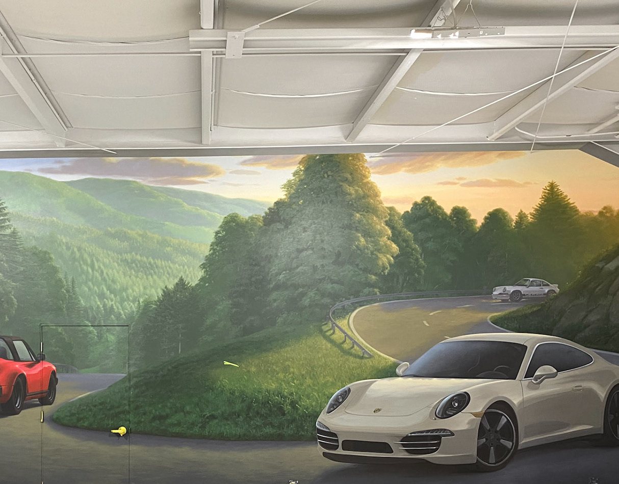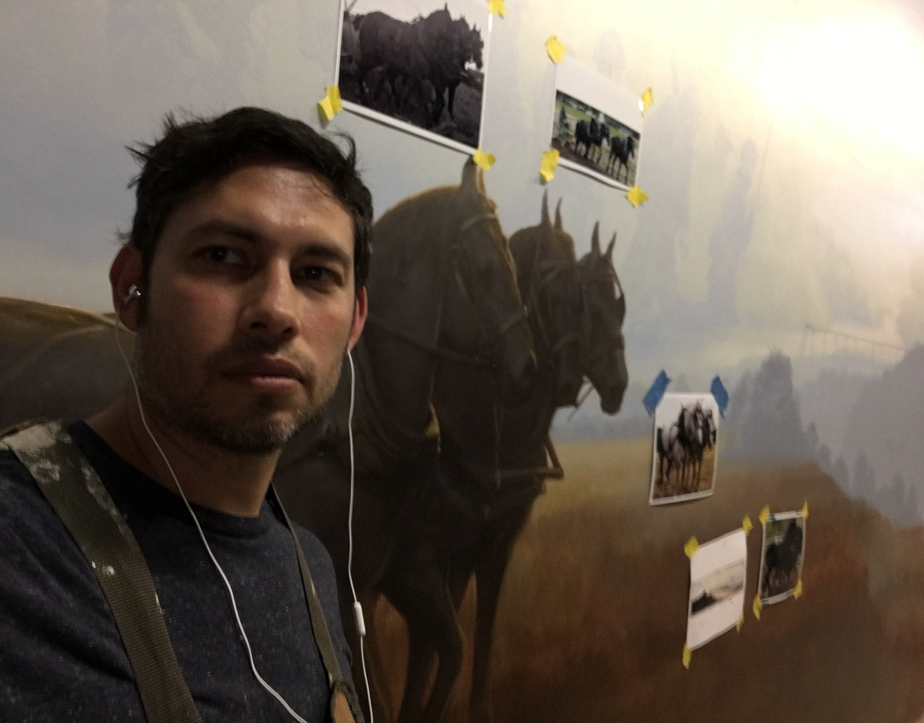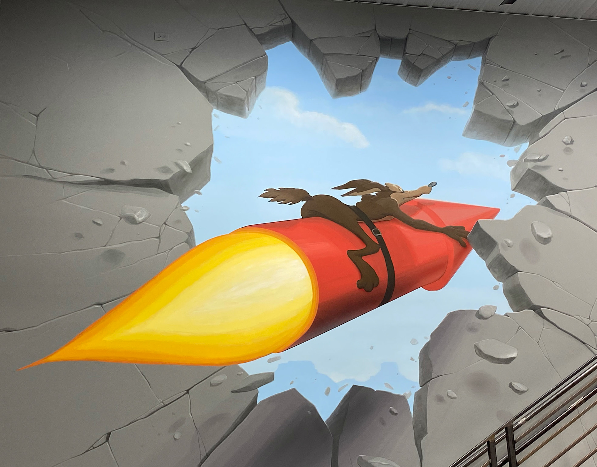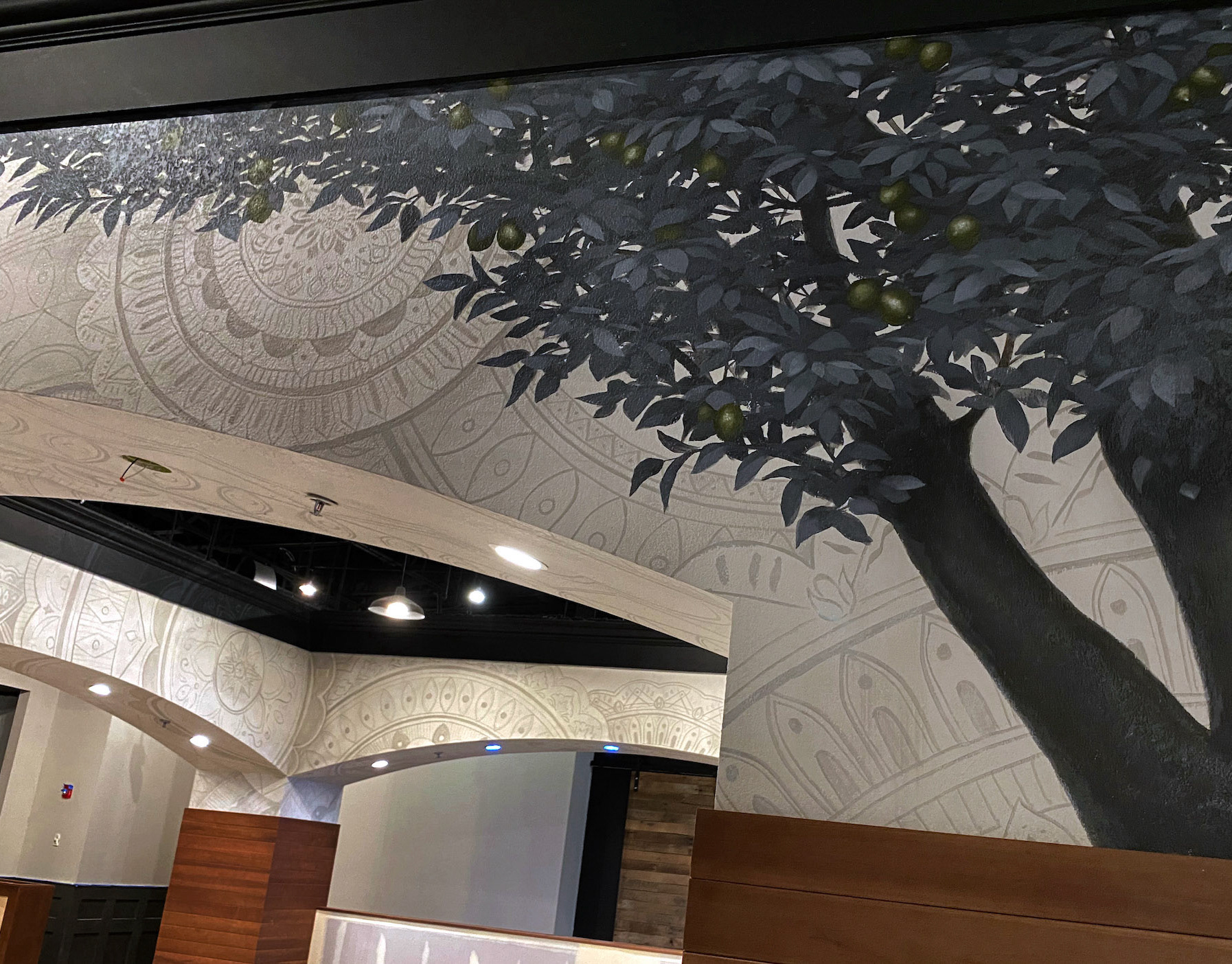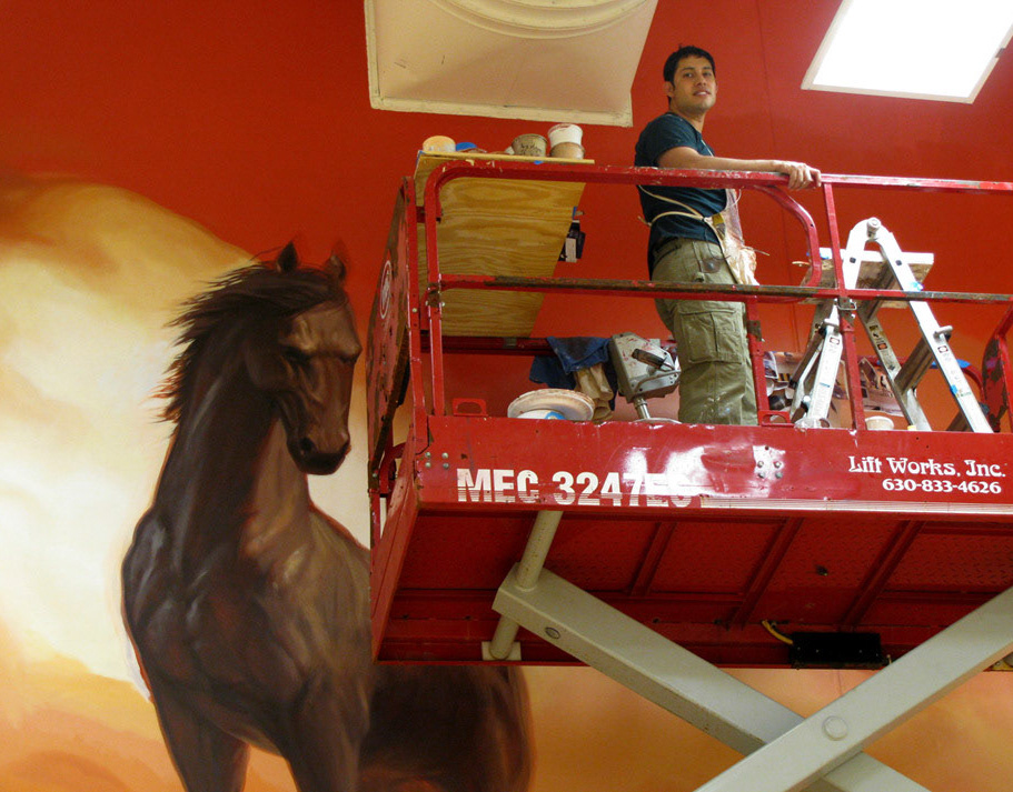 The story behind this mural is that a grove of trees, sadly had to be cut down in order to build The Fountains - an apartment complex in Houston, TX. The developer wanted to bring back some of the lost beauty that was once so visible to all, and so I was hired, all the way from Chicago, Il., to paint this enormous forest mural. It's a massive work of art on two buildings, totaling 550 ft in length and 60 ft in height (nearly two football fields).