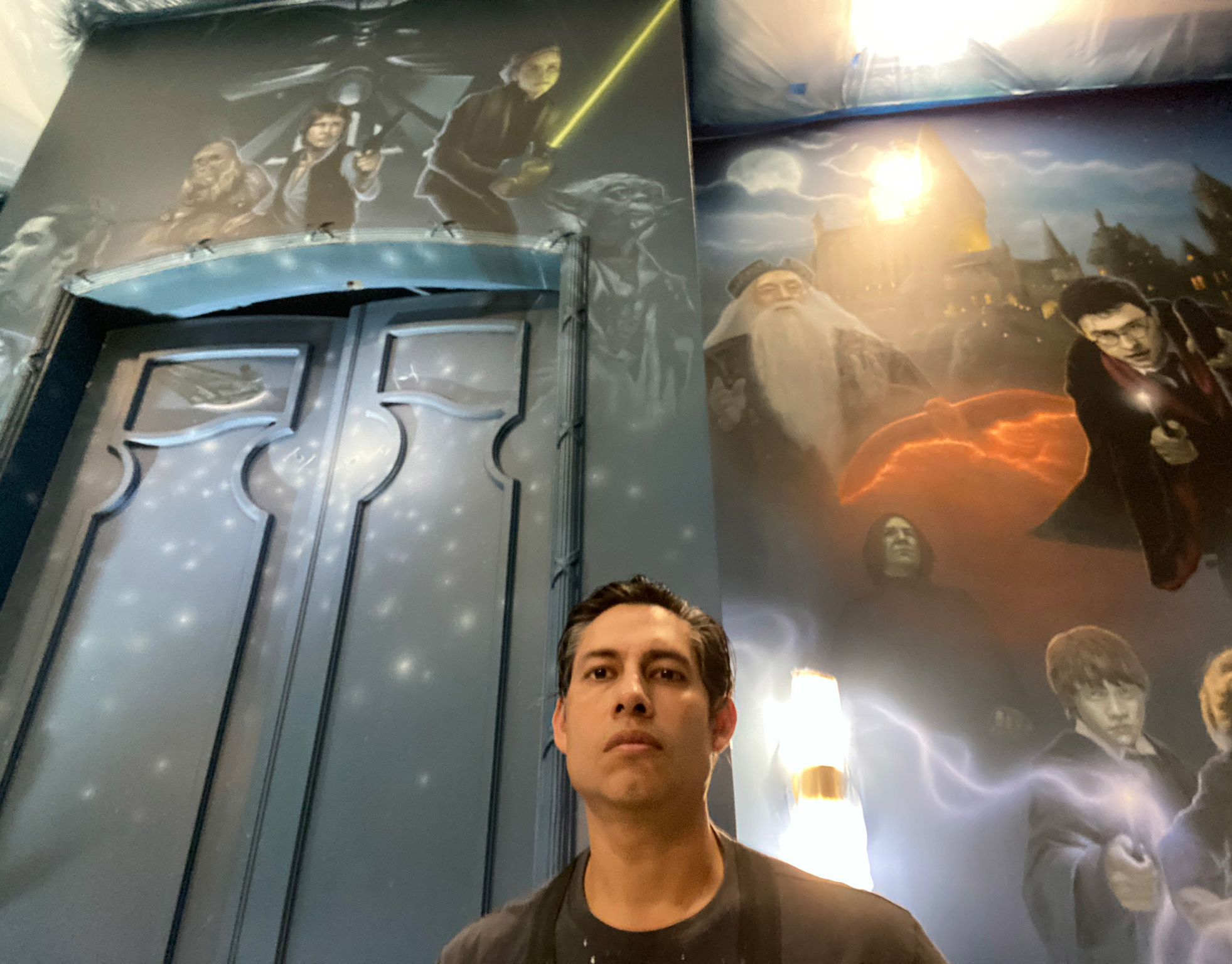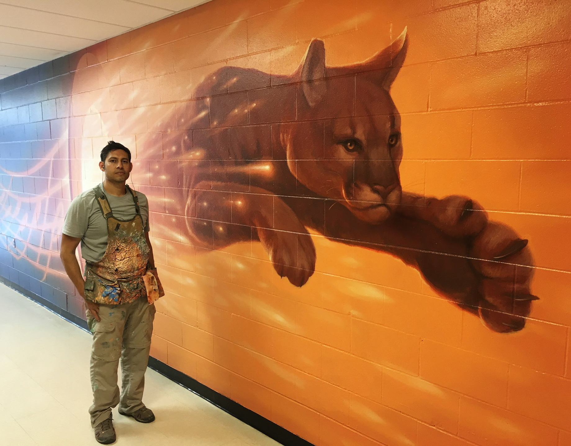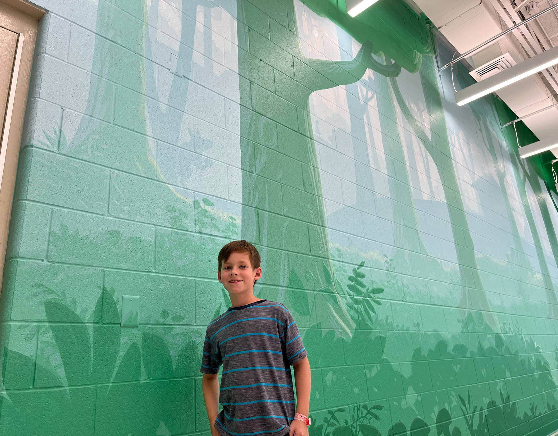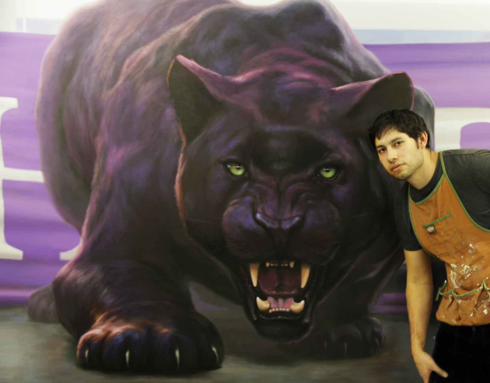 The story behind this mural is that a grove of trees, sadly had to be cut down in order to build The Fountains - an apartment complex in Houston, TX. The developer wanted to bring back some of the lost beauty that was once so visible to all, and so I was hired, all the way from Chicago, Il., to paint this enormous forest mural. It's a massive work of art on two buildings, totaling 550 ft in length and 60 ft in height (nearly two football fields).